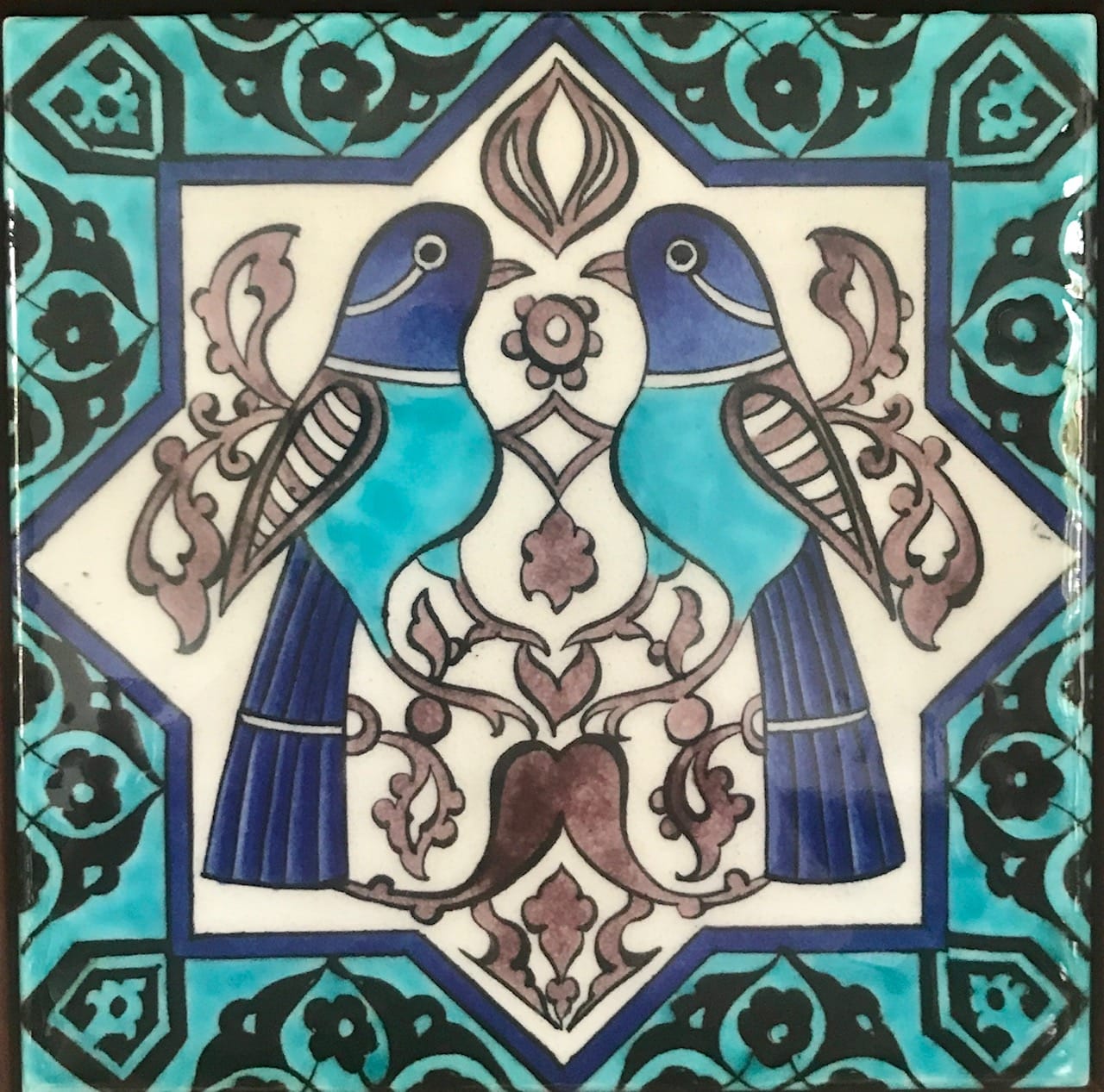 The most common and best-known Ottoman tiles and pottery are the underglazed polychrome wares manufactured in İznik and also as a secondary center in Kütahya from the middle of the 16th century to the end of the 17th century from a kind of hard, white clay. Up to seven colours were employed in these tiles, a distinctive feature being the beautiful slightly embossed tomato red. This unique colour was destined to be lost forever after the middle of the 17th century. The other colours are white, blue, turquoise, dark blue, green and black. A white slip under the clear, high, quality glaze, make the colours shinier. The same process and colour scheme are used both in ceramics and tiles. The most popular designs use naturalistic floral motifs but Chinese motifs are still to be found. These original creations of the Ottoman period with realistically drawn tulips, carnations, roses, rosebuds, violets, hyacinths, pomegranate, blossoms, peonies, spring branches, apple and cypress trees, branches of grapes, bouquets, vases, oil-lamps, large palmette leaves, medallions, arabesques, large thuluth lettering, imitation marble, animal figures, and birds give the impression of a veritable garden of paradise. Chinese three balls and clouds continue the Far Eastern influence begun in the blue and white group. We encounter several motifs peculiar to pottery, such as galleons, sailing boats and various animal motifs like birds surrounded by flowers, hare, deer, dogs, hunting animals, sphinxes, monkeys and fish, together with fighting scenes between lions and stags or between lions and bulls, all treated in the stylized manner of Seljuks.